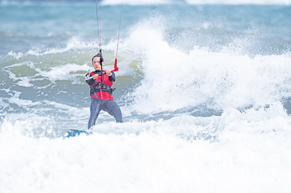 龙王头沙滩上,“00后”姑娘陈逸嫚正整理风筝板,准备迎风而上,迎接挑战。她娴熟地驾驭着风筝,巨大的伞翼在空中划出饱满而有力的弧线。她借力腾空,在海天之间自如地翻滚、旋转,那一刻,她化身为浪尖的飞鸟,与风共舞,留下一抹灵动的剪影。