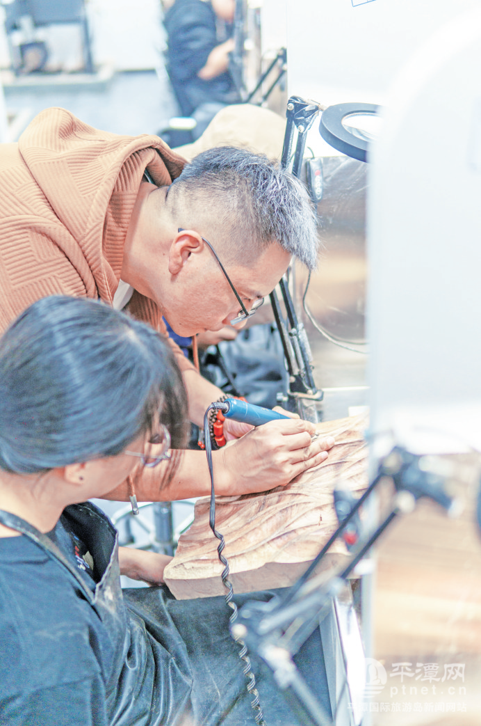 商贸管理学院电子商务专业的大二学生王绍宇就是其中之一。一年前,他加入工作室,从最基础的红砖干泡台开始,逐步涉猎石雕、木雕。为了学好这项技艺,他经常利用课余时间勤学苦练。“学习雕刻后,我变得更有耐心,做事也更注重细节。在工作台上经常一刻就是三小时。”王绍宇说,“之前我在平潭海边捡了石头,想刻个小摆件送给姐姐。我会认真学习雕刻,希望能创作出更多优秀的作品。”