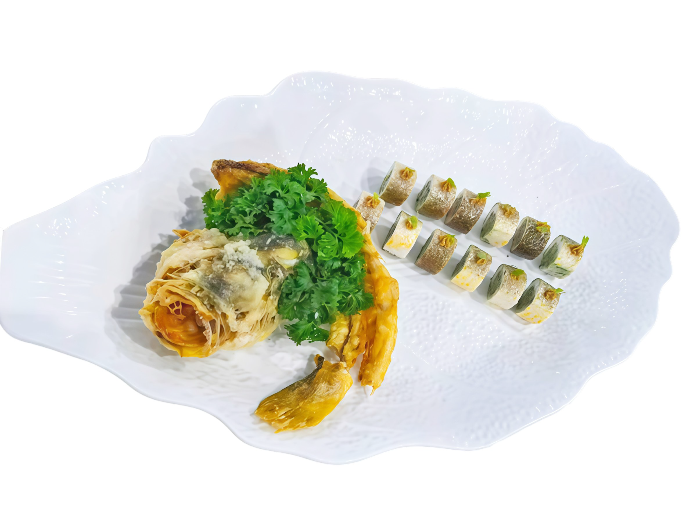 这道获奖作品展现了平潭厨师对传统的大胆突破。传统的潮汕“鱼饭”以鱼为唯一主角,而姚志强团队却匠心独运地加入了吸收鱼汤精华的秘制米饭,趁热卷进剔刺后的完整鱼肉中,让“鱼饭”之名真正名副其实。成菜后的黄鱼鱼皮金亮,肉质细嫩,米饭饱含汤汁的鲜美,再佐以清爽小菜,既保留了南方菜的清秀韵味,又蕴含着渔家菜的厚实底蕴。
