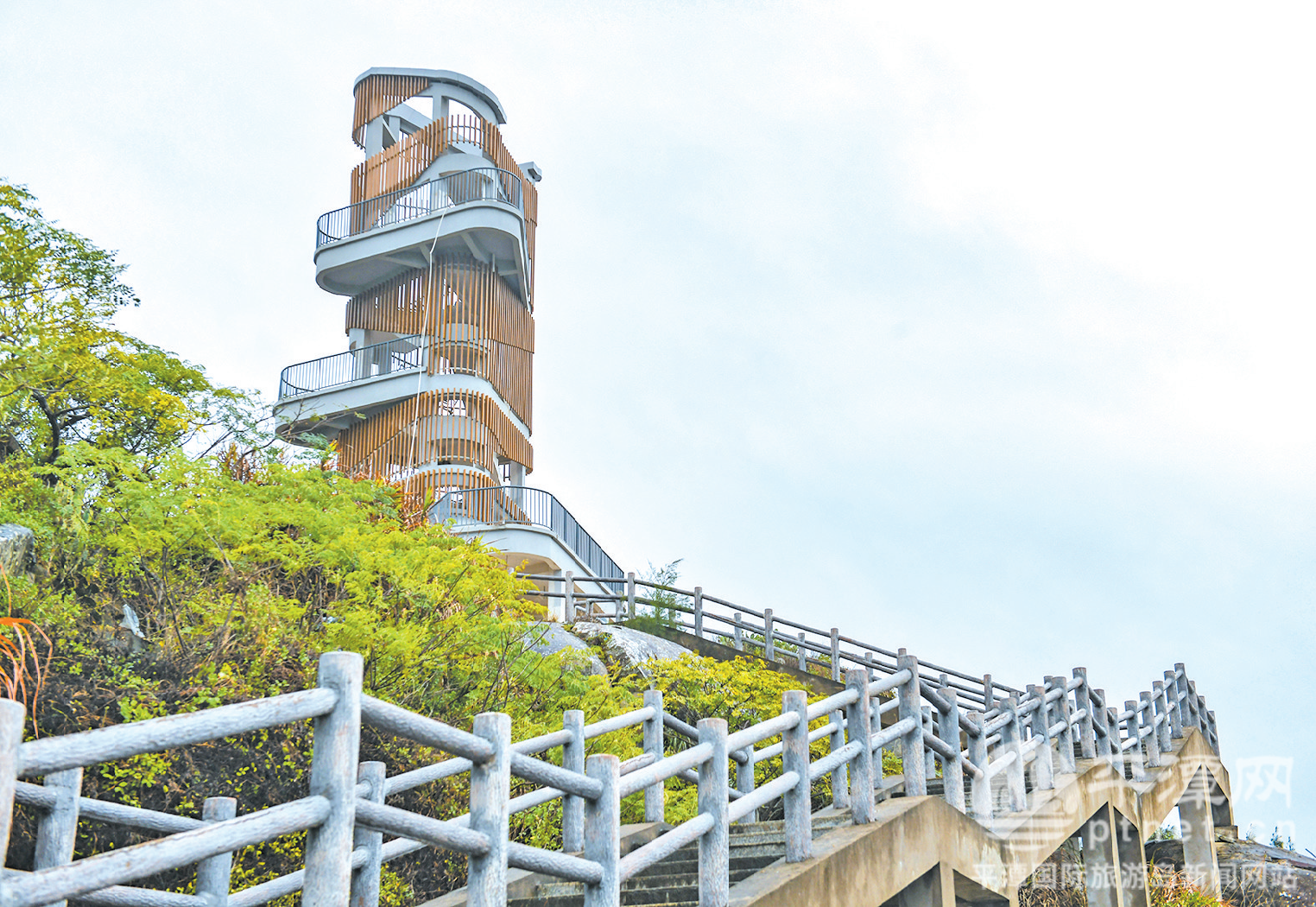 瞭望塔位于马腿村一处山地高处,总建筑面积132.5平方米,高约21米,设计4个观景平台。游客可以沿着阶梯逐步登高,观赏海岸、幸福洋防护林风景。目前,瞭望塔建筑主体已经全面落成,正在进行后续现场清理工作。