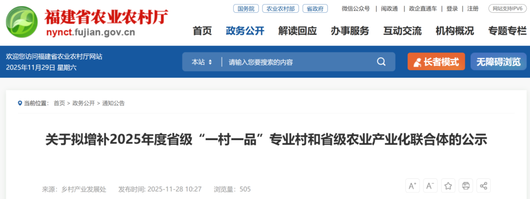 根据福建省农业农村厅《关于开展2025年度省级“一村一品”专业村和省级农业产业化联合体申报工作的通知》要求,在各地申报、省级遴选的基础上,经研究,拟确定福州市福州连江县筱埕镇大埕村(鲍鱼)等238个村为2025年度省级“一村一品”专业村,确定连江信洋丁香鱼产业化联合体(牵头龙头企业:连江信洋水产有限公司)等35个农业产业化联合体为2025年度省级农业产业化联合体。现将名单予以公示,公示期为2025年11月28日—12月5日。如有异议,请于公示期间实名向省农业农村厅农村乡村产业发展处反映。反映情况要实事求是,并提供证明材料。
