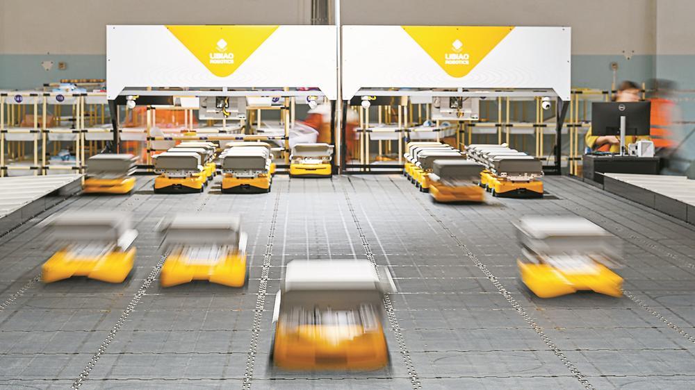 在两岸跨境电商园3号仓,分拣机器人正忙着分装货物。江信恒 摄