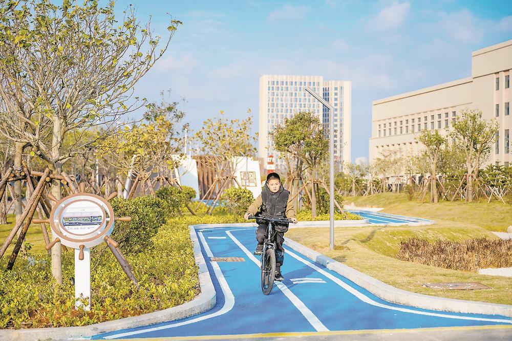 小朋友在位于平潭海事局的口袋公园里骑车游玩。林君斌 摄