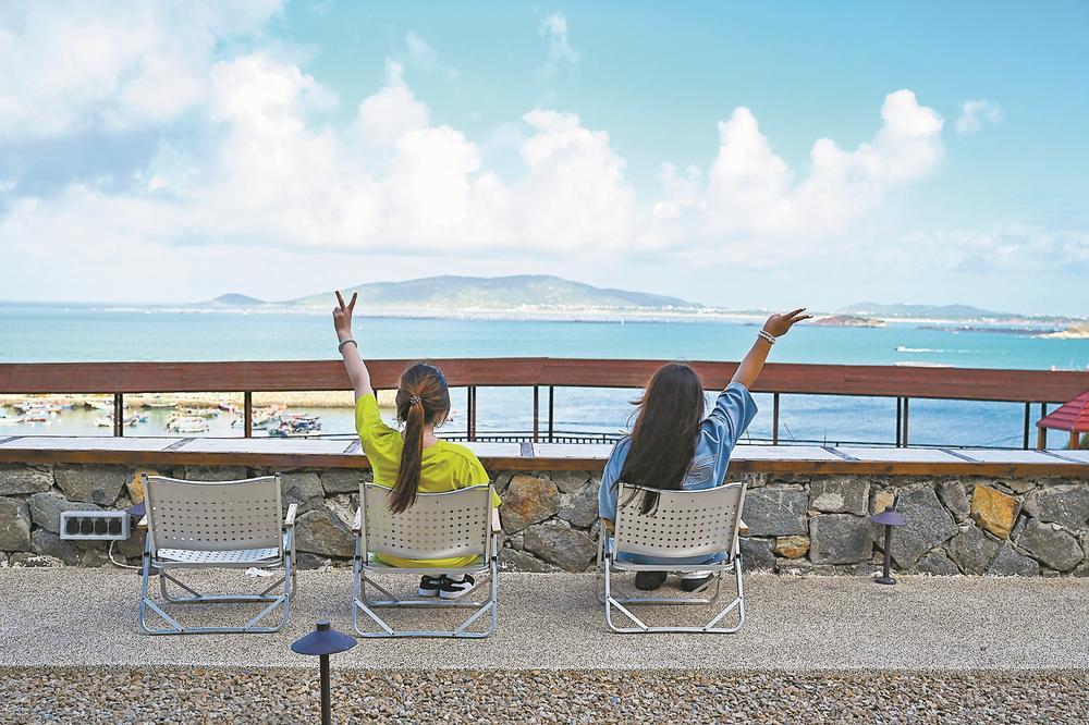 在君山片区渔屿村,游客坐在椅子上眺望大海。江信恒 摄