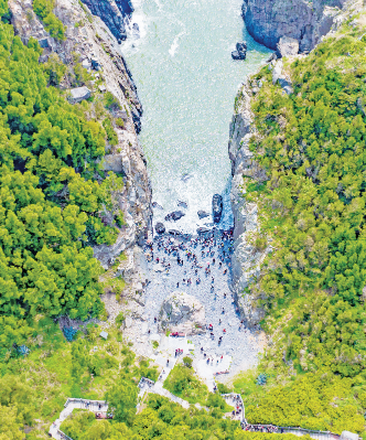 前往位于君山片区王爷山南麓的仙人井景区。这里被誉为“东海仙境”,核心景观是由海浪亿万年雕琢而成的巨大海蚀竖井——仙人井。当潮水涌入,井底雷鸣,蔚为壮观。沿着步道前行,仙人谷、仙人峰等海蚀地貌依次展现,多个观景平台让您能从不同角度感受大自然的鬼斧神工。不妨在沿途的文创摊位上稍作停留,那些用贝壳、海螺制成的精美饰品,正是一份来自大海的生动纪念。