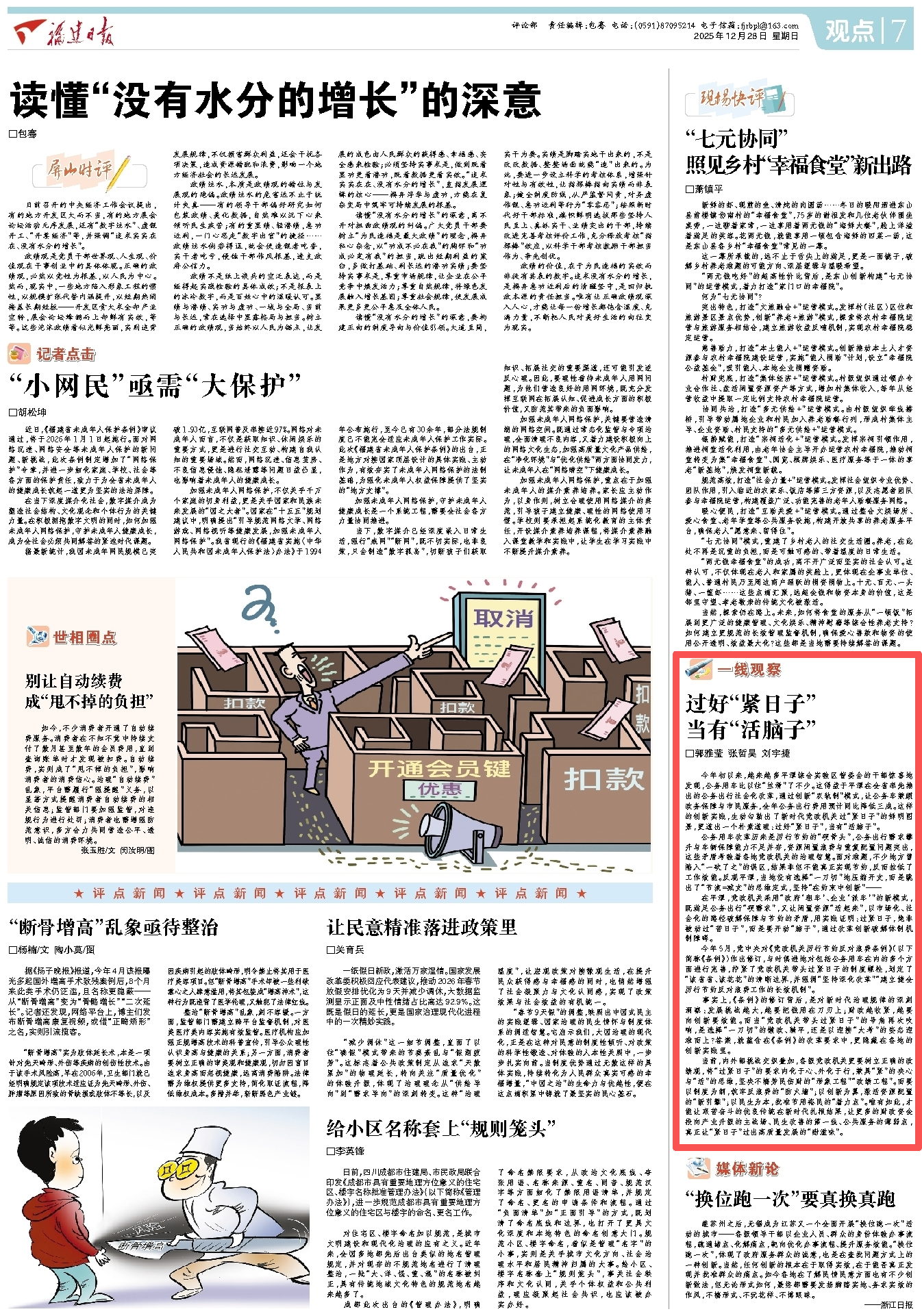 当前,内外部挑战交织叠加,各级党政机关更要树立正确的政绩观,将“过紧日子”的要求内化于心、外化于行,兼具“紧”的决心与“活”的思维,坚决不搞劳民伤财的“形象工程”“政绩工程”。而要以制度为纲,筑牢反浪费的“防火墙”;以创新为翼,激活资源配置的“新引擎”;以民生为本,找准节用裕民的“着力点”。唯有如此,才能让艰苦奋斗的优良传统在新时代扎根结果,让更多的财政资金投向产业升级的主战场、民生改善的第一线、公共服务的薄弱点,真正让“紧日子”过出高质量发展的“甜滋味”。