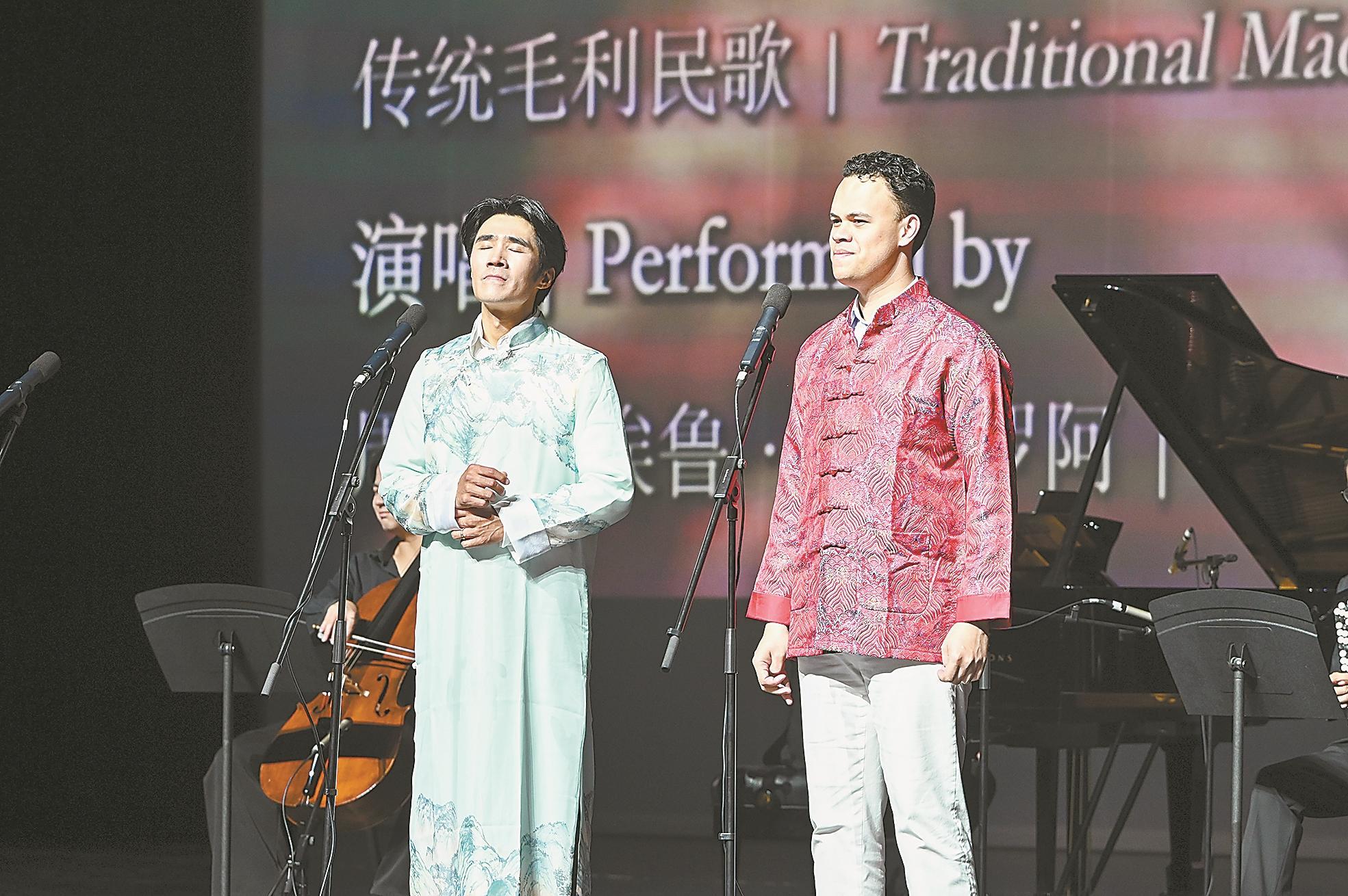 在《大地之声》音乐会上,周楠(左)与埃鲁一同演唱新西兰传统毛利民歌。通讯员 江信恒 摄
