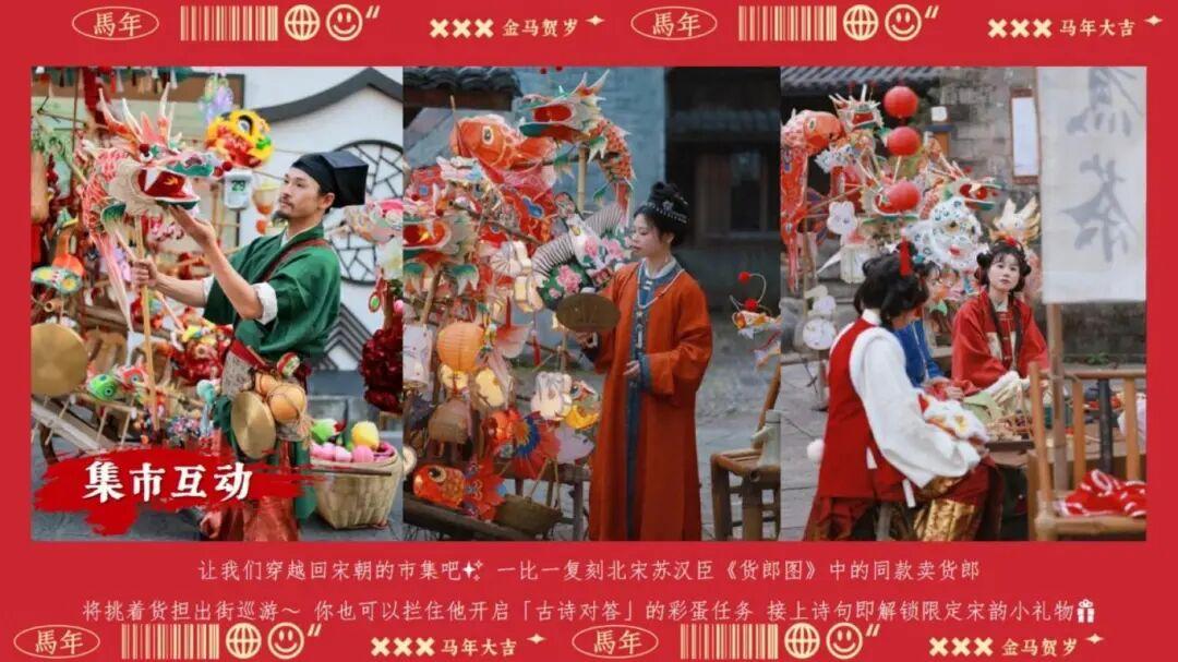 鱼龙灯巡游搭配霸气舞龙表演震撼登场,光影流转间满是团圆喜悦。复刻北宋《货郎图》的主题巡游超有穿越感,不仅能偶遇货郎还能参与古诗对答彩蛋任务,答对即可解锁新春小惊喜~
