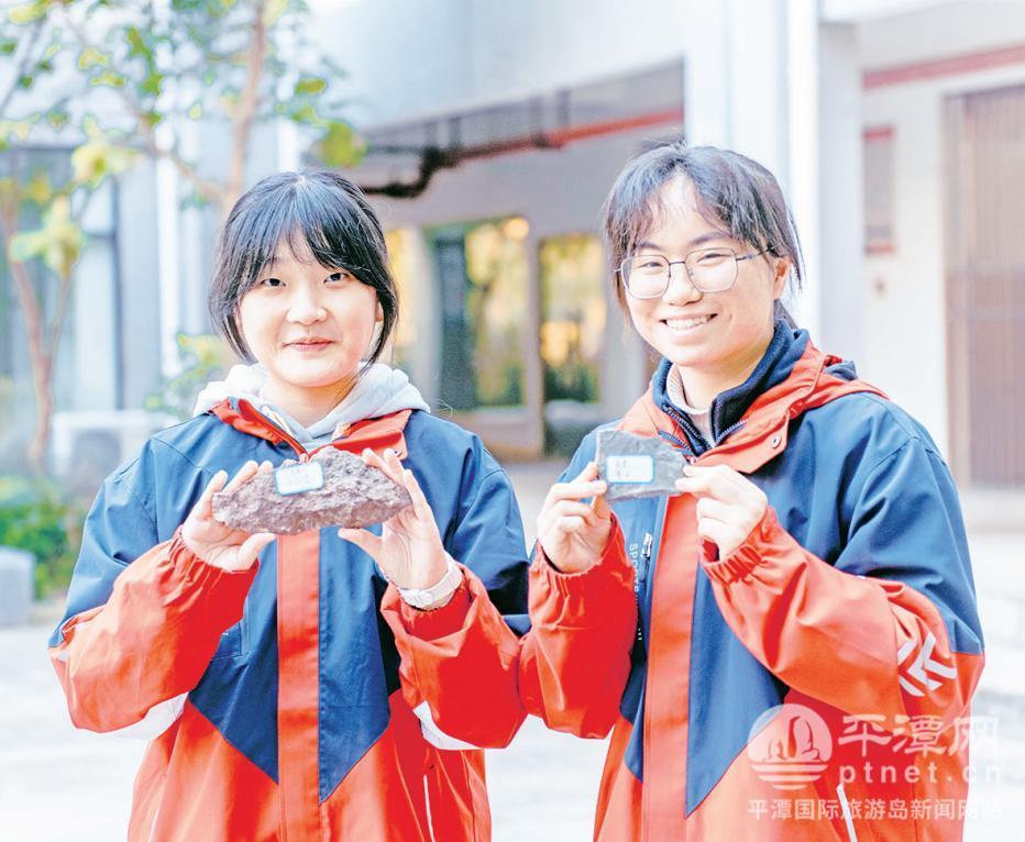 学生展示冯月銮老师收集的岩石标本。