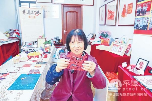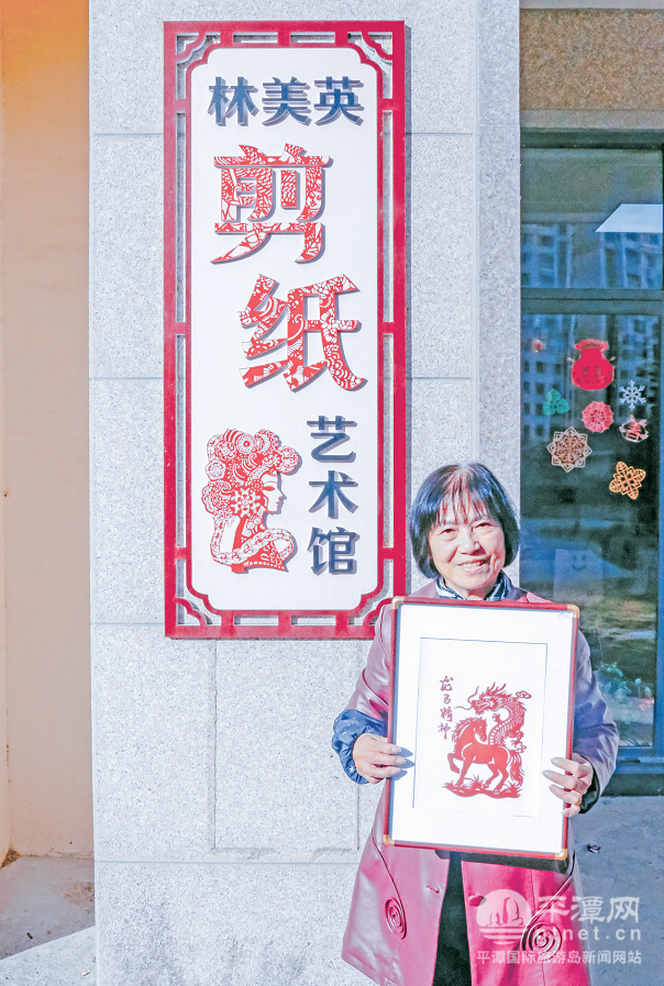 馆内,门楣窗棂贴满了缤纷的窗花,墙上的人物剪纸、十二生肖等作品生动传神。尤其显眼的是那幅写有“金剪银纸”字样的书法作品,静静悬挂着,似在诉说主人与剪纸相伴的岁月。林美英笑着说:“自从搬来这间新工作室后,地方宽敞多了,创作大幅作品更方便了。”