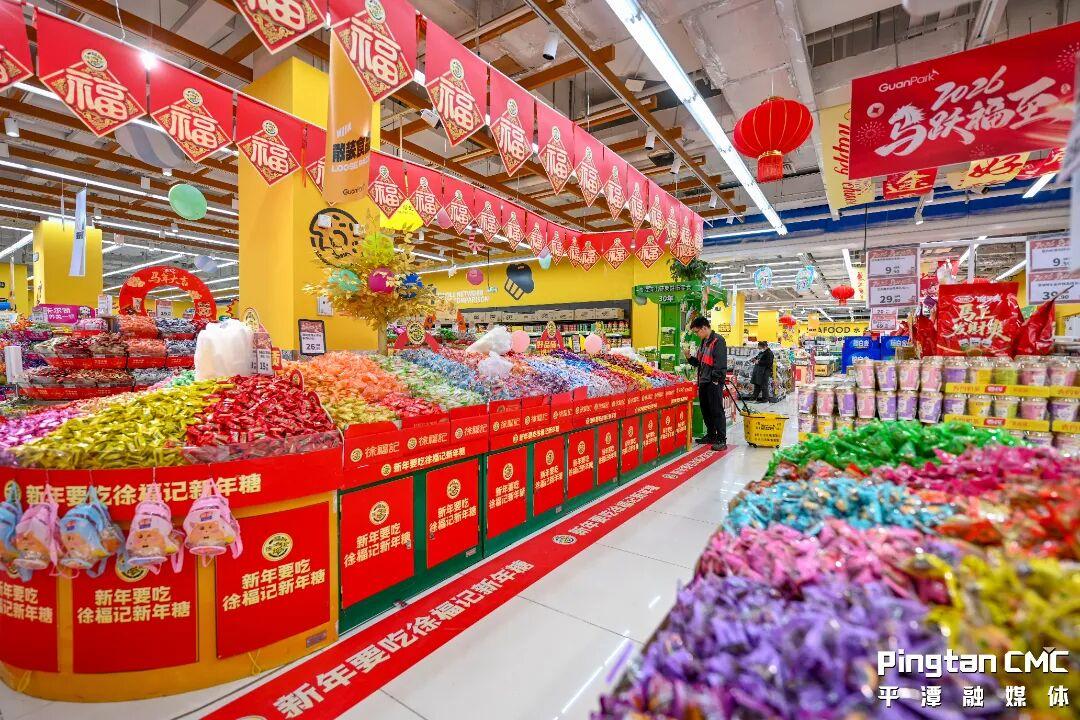 翠园中路一家超市的入口处,年货专区早已布置得满满当当。成箱的糖果、瓜子、坚果堆起座座 “小山”,礼盒区也摆满了包装精美的节日礼品。