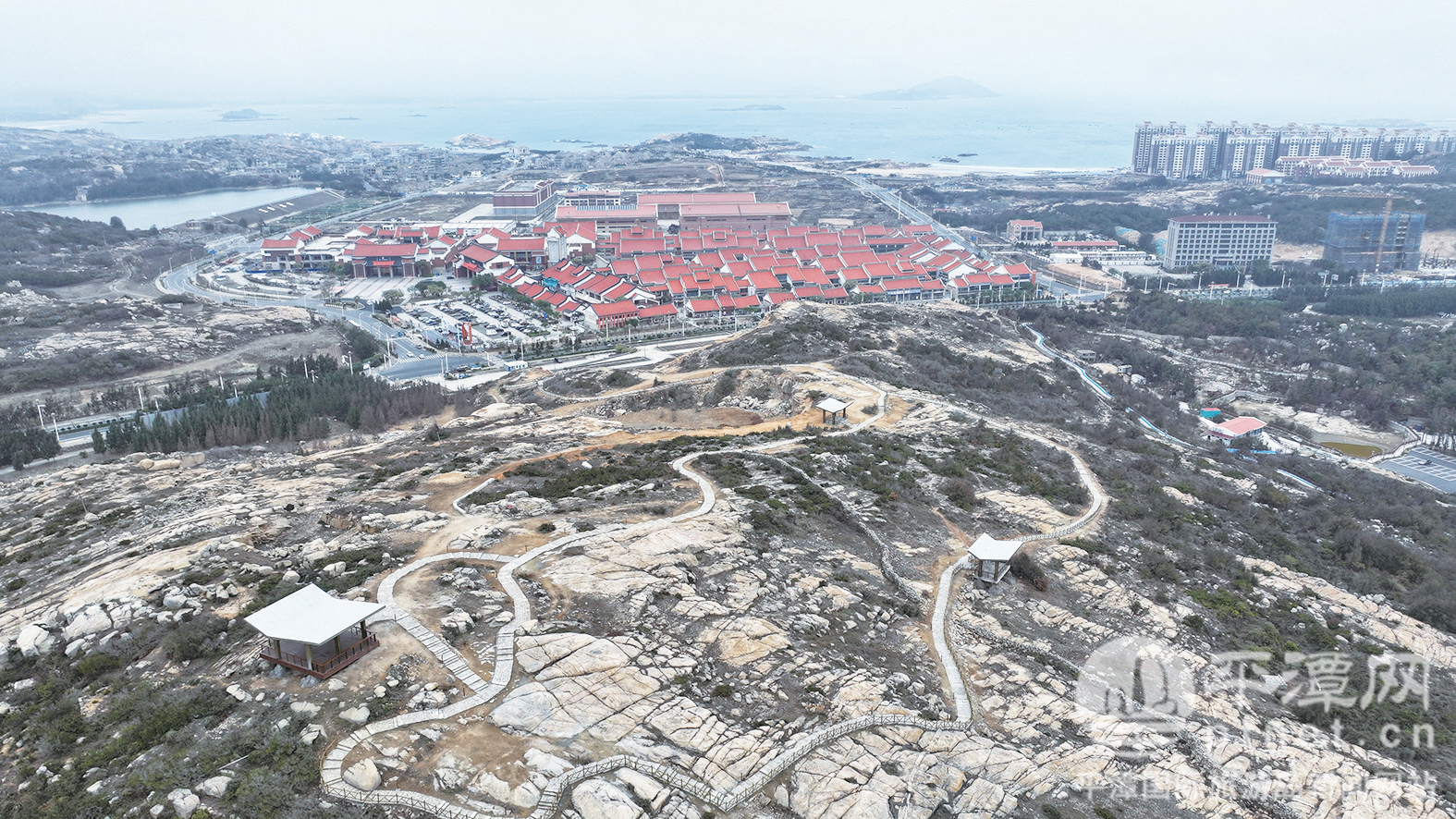记者沿平潭台湾小镇对面的步道入口拾级而上,沿途视野渐次开阔,行至高处,可俯瞰平潭台湾小镇全貌,山海交融之景尽收眼底。