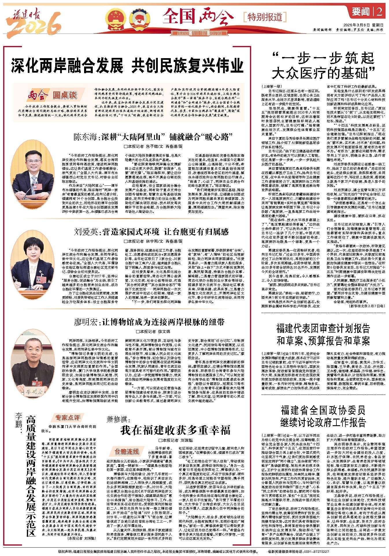 “今年政府工作报告提出,深化两岸交流合作和融合发展,共同传承弘扬中华文化。这让我们基层工作者倍感使命在肩。”全国人大代表,平潭综合实验区海坛街道台康社区党委书记、居委会主任刘爱英说。