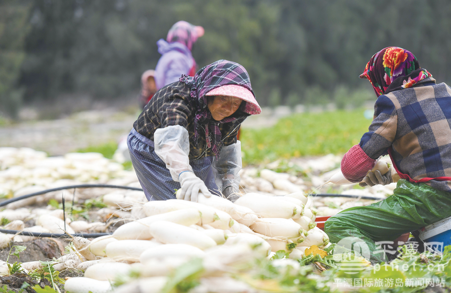 在幸福洋一期,红、白萝卜也迎来采收期。农户们手持镰刀收割,麻利地拔起、去根、摆放,田野里鲜嫩萝卜码放整齐,等待运往市场。“今年萝卜长势喜人、品质优良,产量较往年明显提升,在市场上很受欢迎。”种植户杨文滨说。