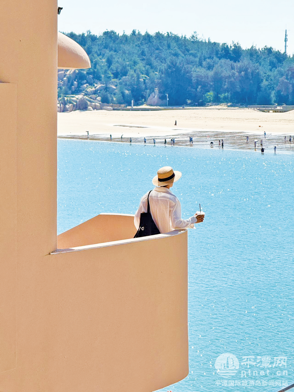 咖啡厅里坐了几桌客人。这个270度看海的空间是民宿最受欢迎的地方,落地窗外就是坛南湾的海面,波光粼粼。有人举着手机在各个角落拍照,有人坐在窗边发呆。绝美露台上,海天一色,让人一时间分不清哪里是海,哪里是天。