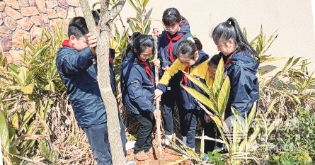 五年(1)班学生林雨潼在学校有个秘密基地——小花园。阳光好的时候,她会抱着书坐在花树下,旁边是开得正好的花,头顶是挂满果实的树枝。“学校真的很漂亮,哪里都能看到绿植。”她说,“眼睛舒服,心情也平静。”