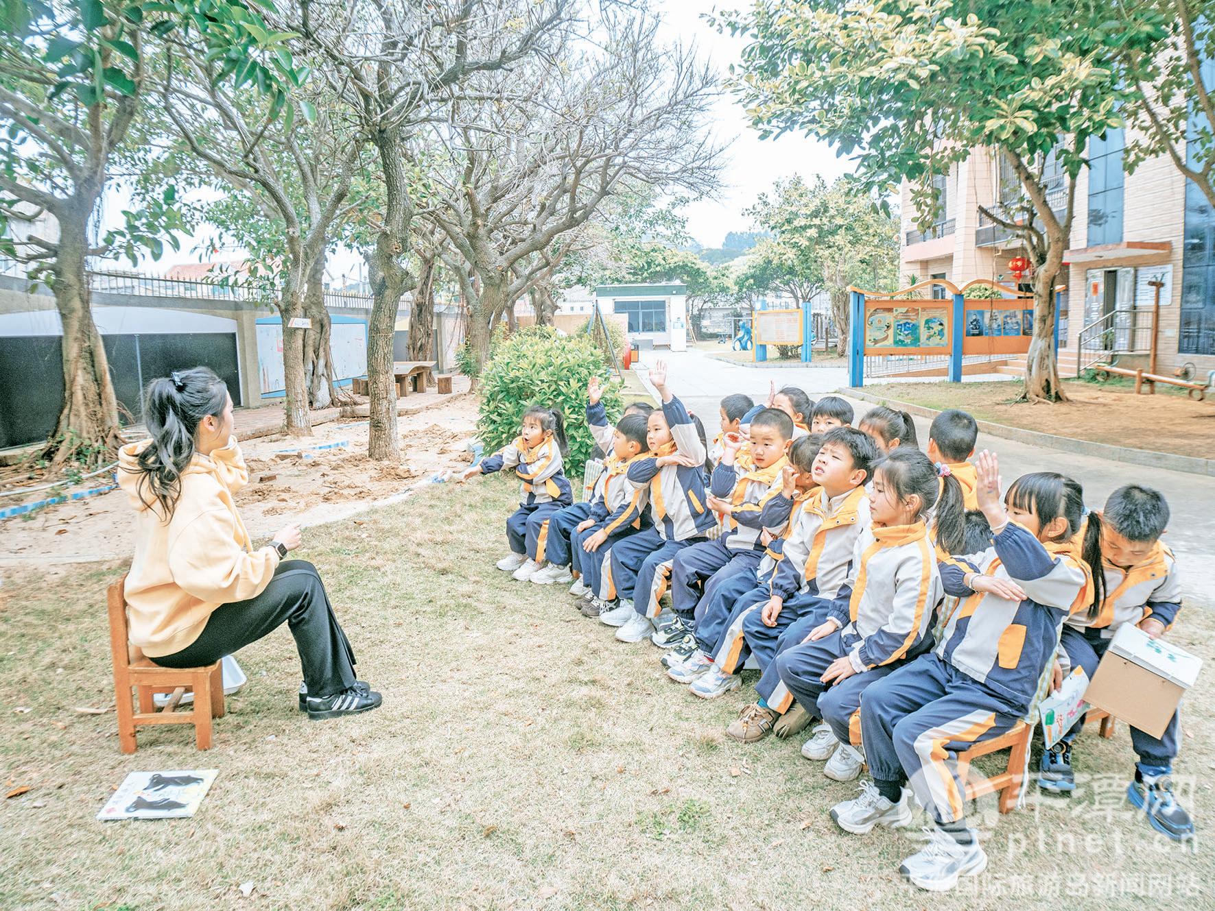 老师带孩子们在户外上绘本阅读课。