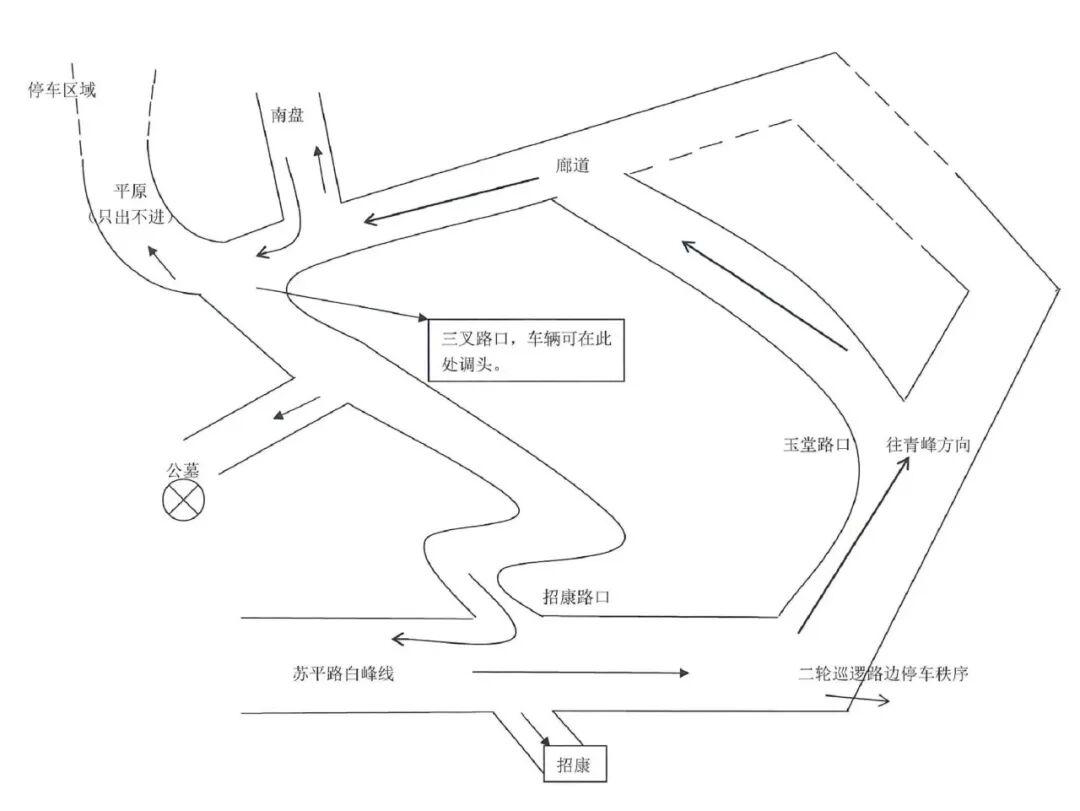 北部生态廊道路内实行单侧(靠山体一侧)停车和单向循环通行措施,社会车辆统一从青峰村路口、玉堂村后山路口驶入,南岛路往公墓方向路口、廊道丰田村路口、廊道平原路口为车辆出口,社会车辆请按沿线指示标识单向通行。