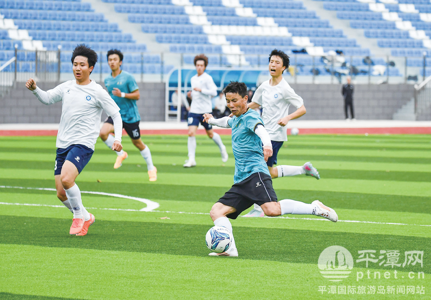 平潭队(蓝色队服)与福建技术师范学院足球队(白色队服)开展比赛。