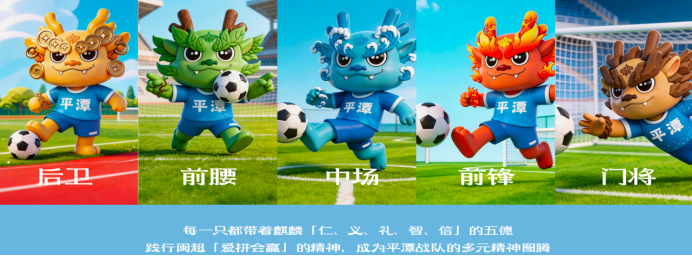 以麒麟仔为核心原型,打造出金运仔、木生仔、水灵仔、火烈仔、土安仔五位各具特色的吉祥物。五个形象不仅性格鲜明、寓意吉祥,还分别对应足球场上后卫、前腰、中场、前锋、门将五大关键位置,既体现团队协作精神,也让平潭队的赛场文化更具辨识度与趣味性。