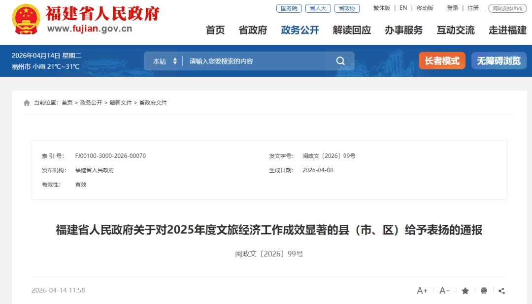 2026-04-14 14:41:06 来源:福建省人民政府门户网站原标题:福建8个县(市、区)获省政府通报表扬