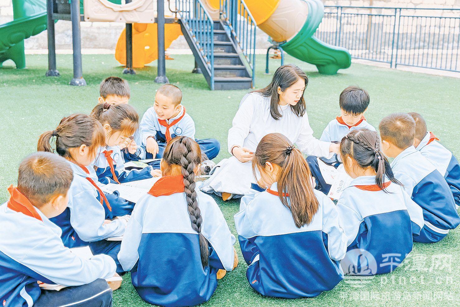 李凤琴与孩子们围坐草坪,共享阅读好时光。