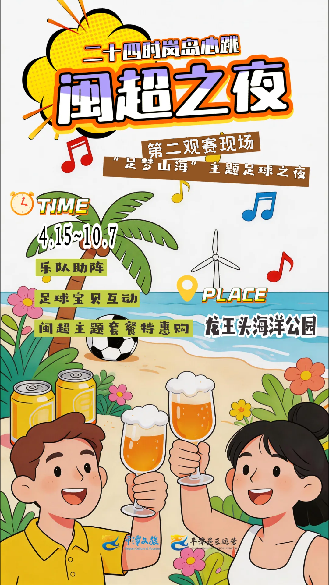 其中,龙王头闽超之夜第二观赛现场已于4月20日后每日14:00至21:00开放(无雨天气)。活动现场推出“闽超”专属餐饮主题套餐,包含酒水、烧烤、小食等品类组合;每逢赛事周末还将举办“闽超”主题夜,融合精酿+小食主题套餐、音乐表演及赛事转播等,进一步丰富游客体验。