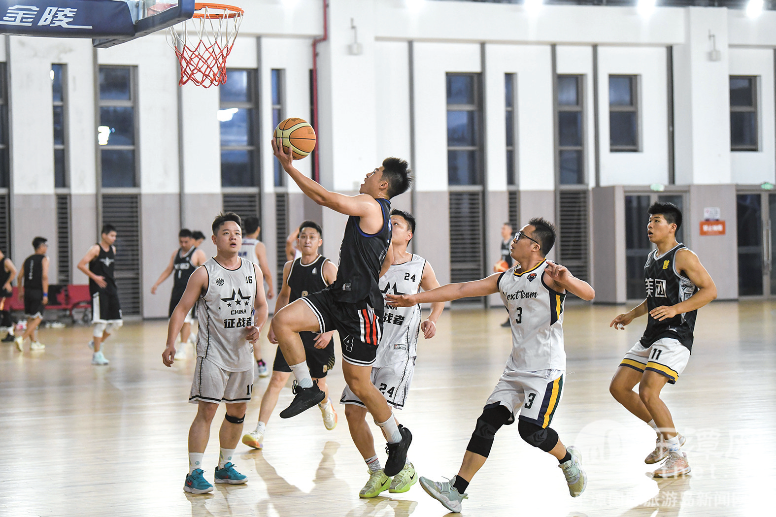 二楼篮球馆内,则是另一番景象。球鞋在地板上急停发出的“吱吱”声、篮球撞击地面的“咚咚”声,与球员们的呐喊声交织回荡。爱好者们挥汗如雨,三步上篮、精准三分,每一次得分都引来一阵欢呼。