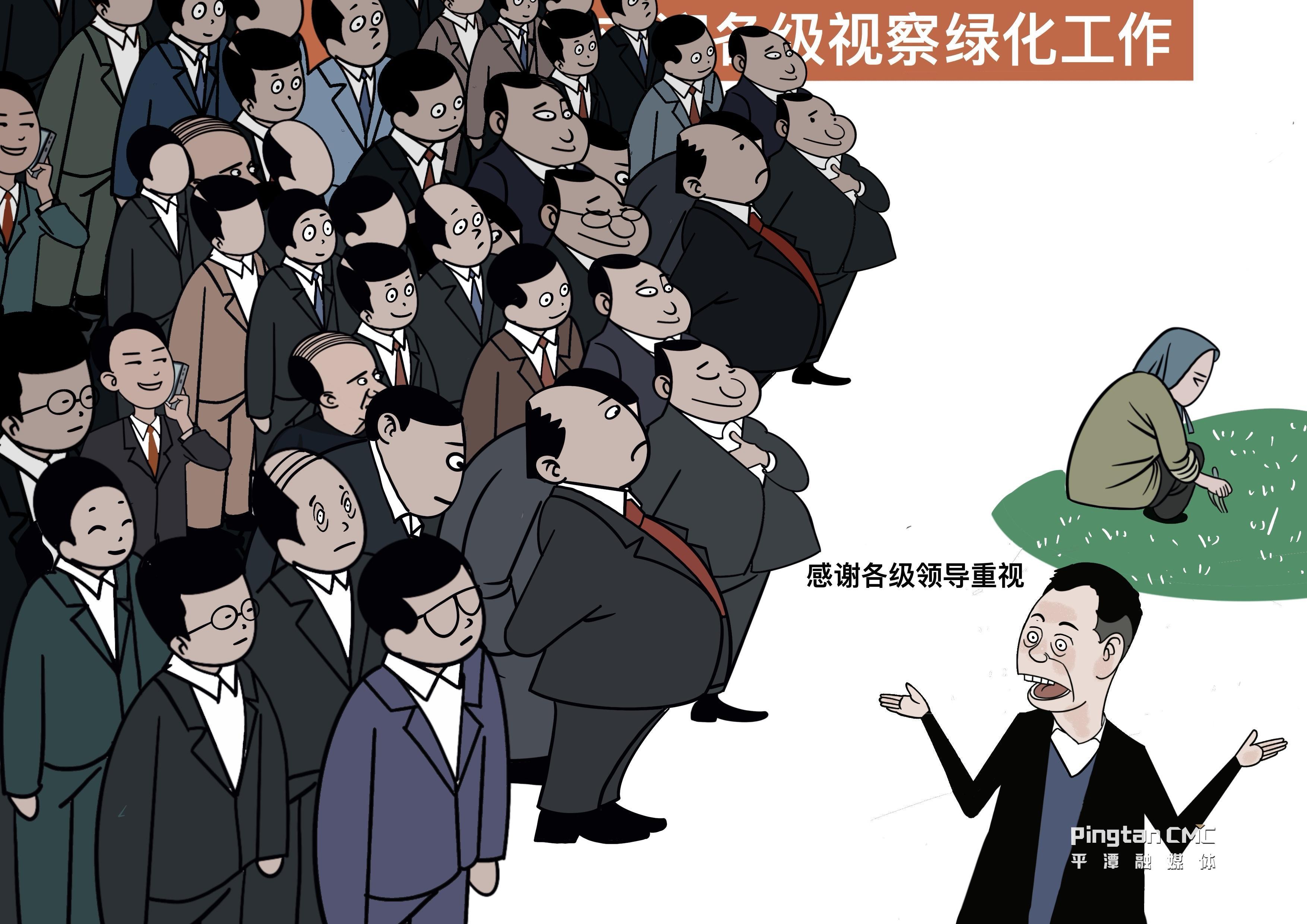 画意:这幅漫画生动呈现了一群身着正装的各级领导视察绿化工作的场景。众多领导整齐列队,场面颇为壮观。然而在画面右侧,一位普通劳动者正独自在草地上辛勤劳作,另有一人张开双手,似在对各级领导的“重视”表达感谢。此漫画意在讽刺形式主义现象。表面上看,众多领导对绿化工作予以高度重视,场面备受瞩目,但实际上真正开展工作的或许只是寥寥数位基层人员。这充分反映出在部分工作中存在严重的重形式、轻实质的问题。
