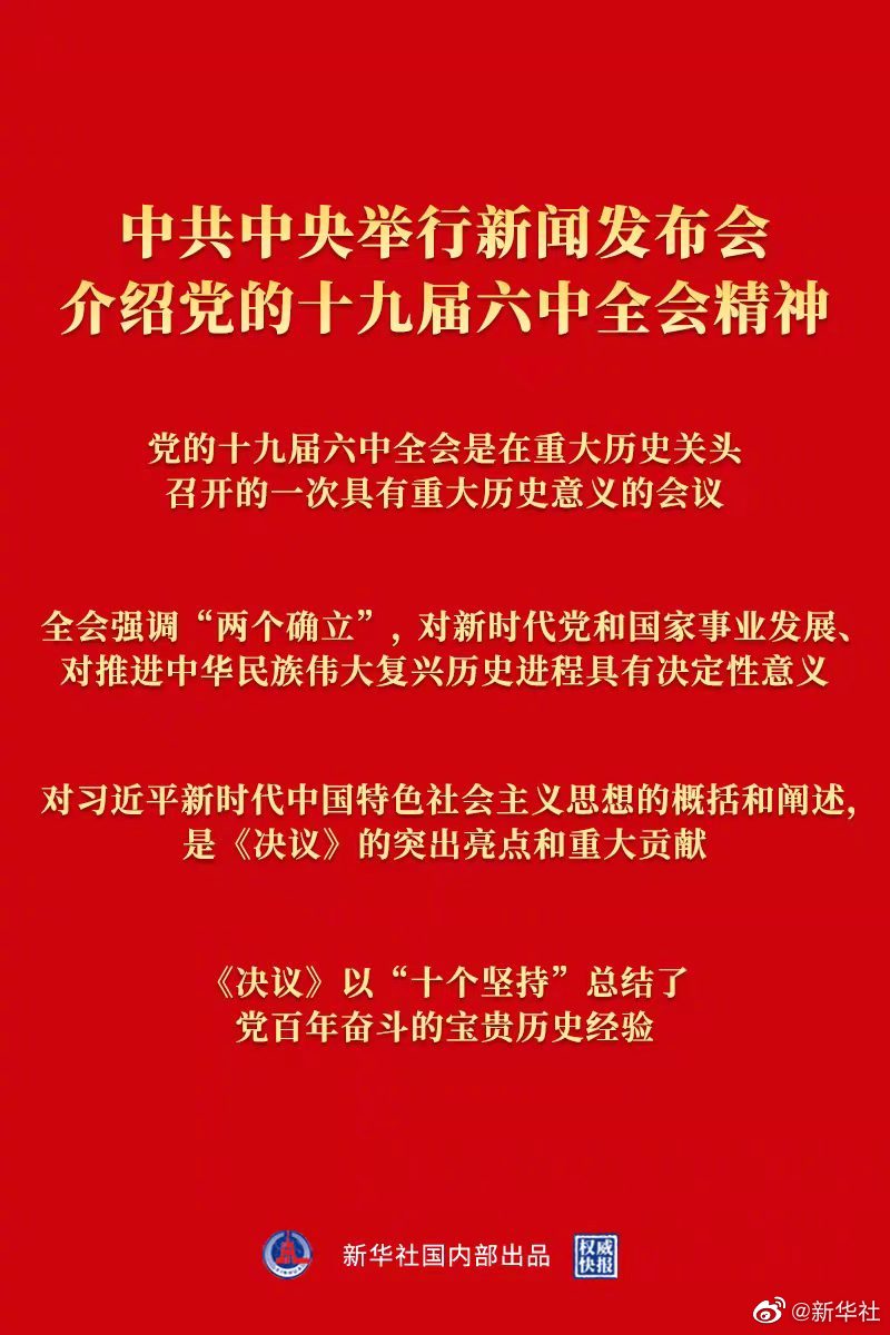2021-11-12 17:10:08 来源:新华社微博原标题:权威快报丨中共中央举行新闻发布会介绍党的十九届六中全会精神