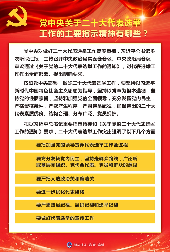 按照党中央部署,做好二十大代表选举工作,要坚持以习近平新时代中国特色社会主义思想为指导,坚持以党章为根本遵循,坚持党的性质宗旨,坚持和加强党的全面领导,充分发扬党内民主,严格资格条件,严密产生程序,严肃选举纪律,确保选出的二十大代表素质优良、结构合理、分布广泛、党员拥护。