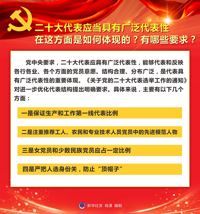 问:二十大代表肩负着全党9500多万名党员的重托和期望,应当具有广泛代表性,请问在这方面是如何体现的?有哪些要求?