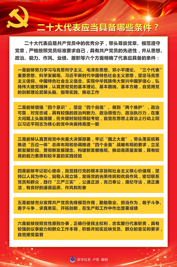 答:《通知》规定,二十大代表应是共产党员中的优秀分子,带头尊崇党章、模范遵守党章,严格按照党员标准要求自己,具有共产党员的先进性,并从思想、政治、能力、作风、业绩、履职等六个方面明确了代表应具备的条件:一是能够努力学习马克思列宁主义、毛泽东思想、邓小平理论、“三个代表”重要思想、科学发展观、习近平新时代中国特色社会主义思想,坚定马克思主义信仰、中国特色社会主义信念、实现中华民族伟大复兴中国梦信心,弘扬伟大建党精神,认真贯彻党的基本理论、基本路线、基本方略,自觉用党的创新理论武装头脑、指导实践、推动工作。二是能够增强“四个意识”、坚定“四个自信”、做到“两个维护”,政治可靠,对党忠诚,具有较强的政治判断力、政治领悟力、政治执行力,在重大问题上头脑清醒,在关键时刻经得起考验,自觉在思想上政治上行动上同以习近平同志为核心的党中央保持高度一致。三是能够认真贯彻党中央重大决策部署,牢记“国之大者”,带头落实统筹推进“五位一体”总体布局和协调推进“四个全面”战略布局的要求,立足新发展阶段、贯彻新发展理念、构建新发展格局、推动高质量发展,具有较高的能力素质和较丰富的实践经验。四是能够牢记初心使命,自觉践行党的根本宗旨和社会主义核心价值观,坚持以人民为中心,站稳人民立场,发扬党的光荣传统和优良作风,密切联系党员和群众,践行“三严三实”,公道正派,克己奉公,遵纪守法,清正廉洁,有良好的道德品质、作风和形象。五是能够充分发挥共产党员先锋模范作用,勤勉敬业、担当作为,敢于斗争、善于斗争,求真务实、开拓创新,在生产和工作中作出显著成绩。六是能够按照党性原则办事,正确行使民主权利,忠实履行代表职责,具有较强的议事能力和群众工作本领,积极并如实反映党员、群众的意见和要求,自觉接受监督。