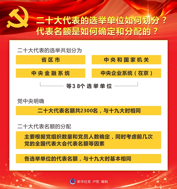 党中央明确,二十大代表名额共2300名,与十九大时相同。二十大代表名额的分配,主要根据党组织数量和党员人数确定,同时考虑前几次党的全国代表大会代表名额等因素。按照这一分配办法,各选举单位的代表名额,与十九大时基本相同。按照惯例,党中央将确定一部分已退出领导岗位的老党员作为特邀代表出席大会。