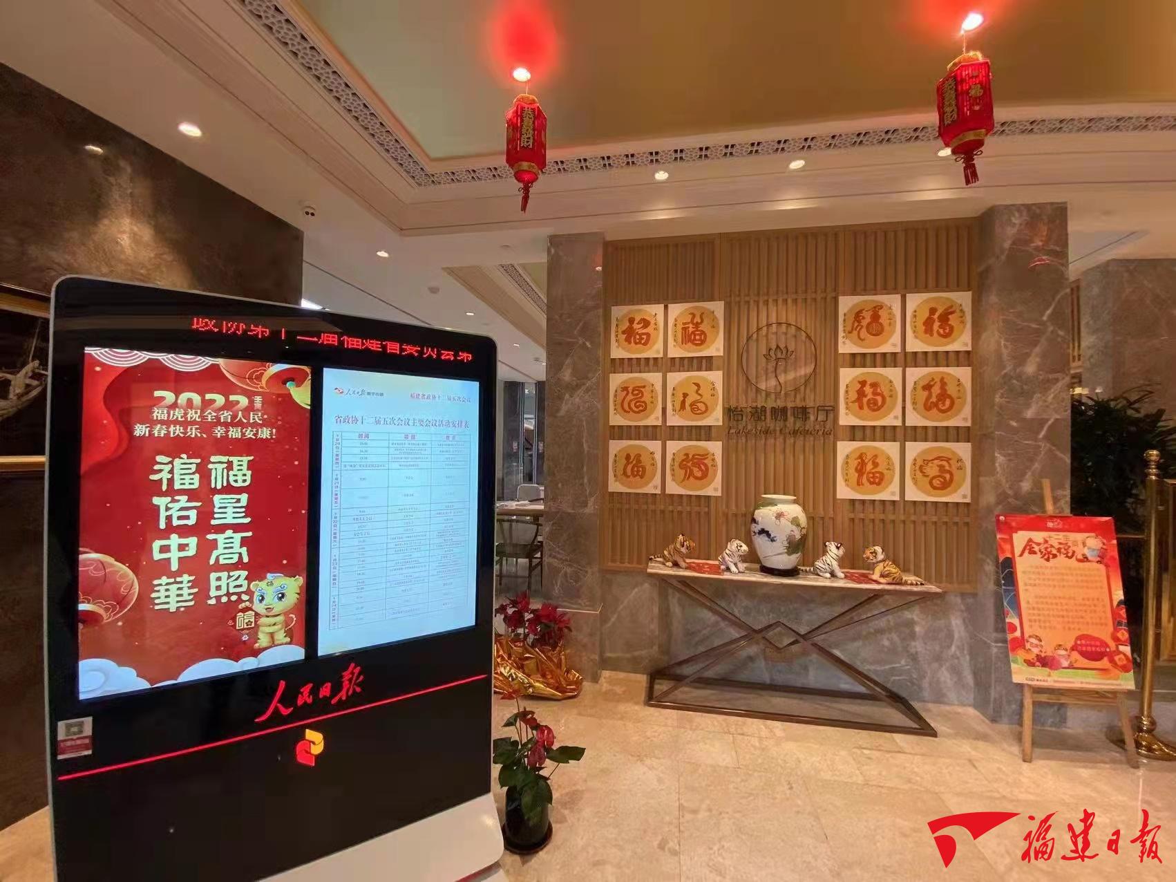 大家在热烈讨论之余,也表达祝福;各种写法的“福”字、各种形式的“福”文化,出现在醒目位置,到处洋溢着迎新春的喜庆氛围。不少代表、委员驻足赏“福”、与“福”合影。