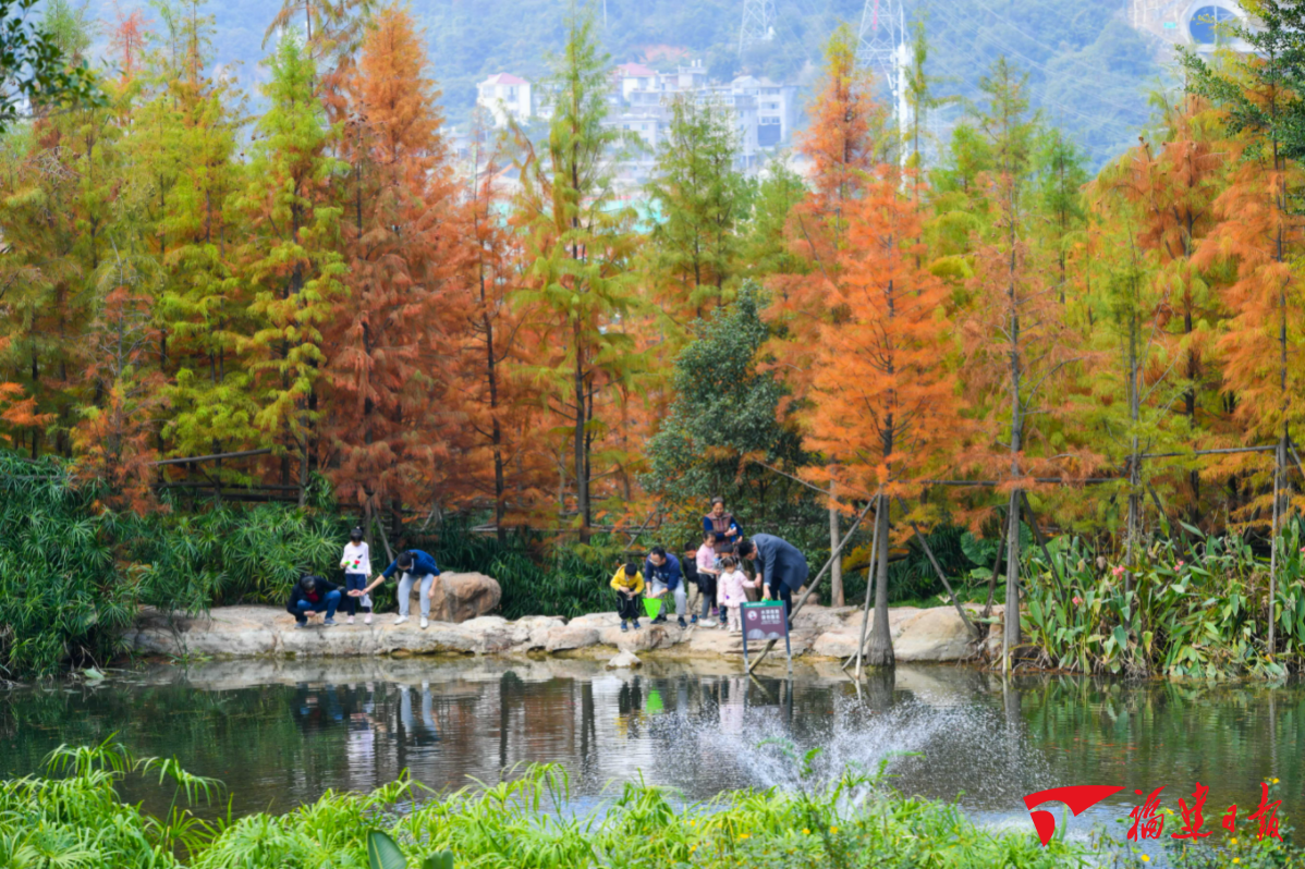 福州福山郊野公园的水杉红了,吸引众多游客和市民前来观赏、拍照打卡。福建日报记者 游庆辉 摄