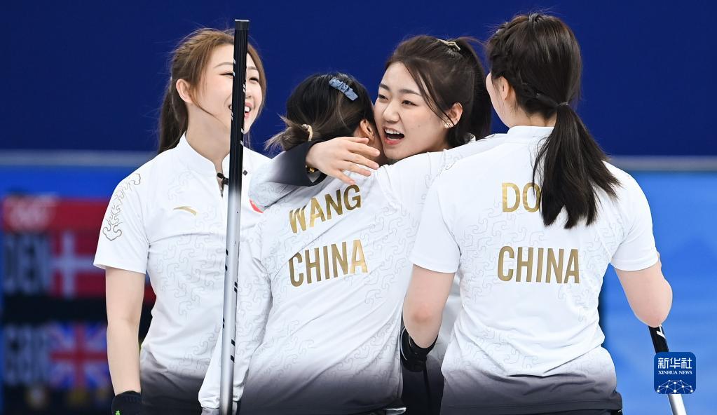 2月13日,中国队选手在北京冬奥会冰壶女子循环赛后庆祝。新华社记者黄孝邦摄