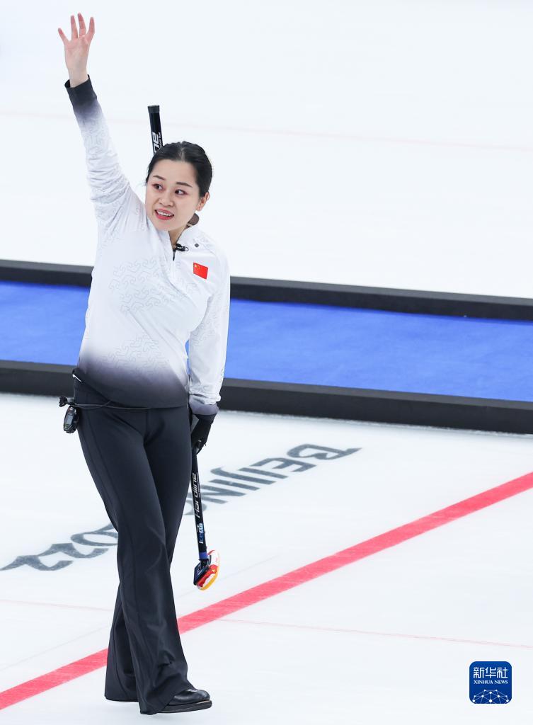2月13日,中国队选手王芮在北京冬奥会冰壶女子循环赛后向观众致意。新华社记者王婧嫱摄