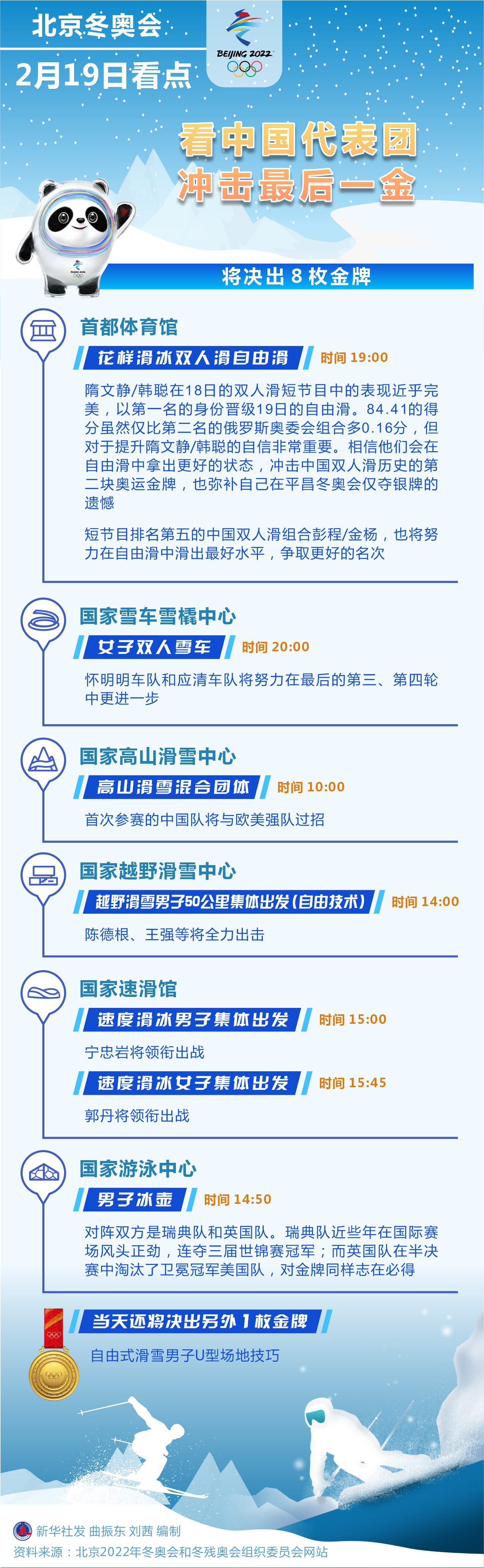 2022-02-19 08:41:35 来源:新华网新华社北京2月18日电(记者张泽伟 王恒志)北京冬奥会在19日迎来倒数第二个比赛日,当天将产生8枚金牌。作为中国代表团最后一个冲金点,花样滑冰双人滑中国选手的表现值得期待。