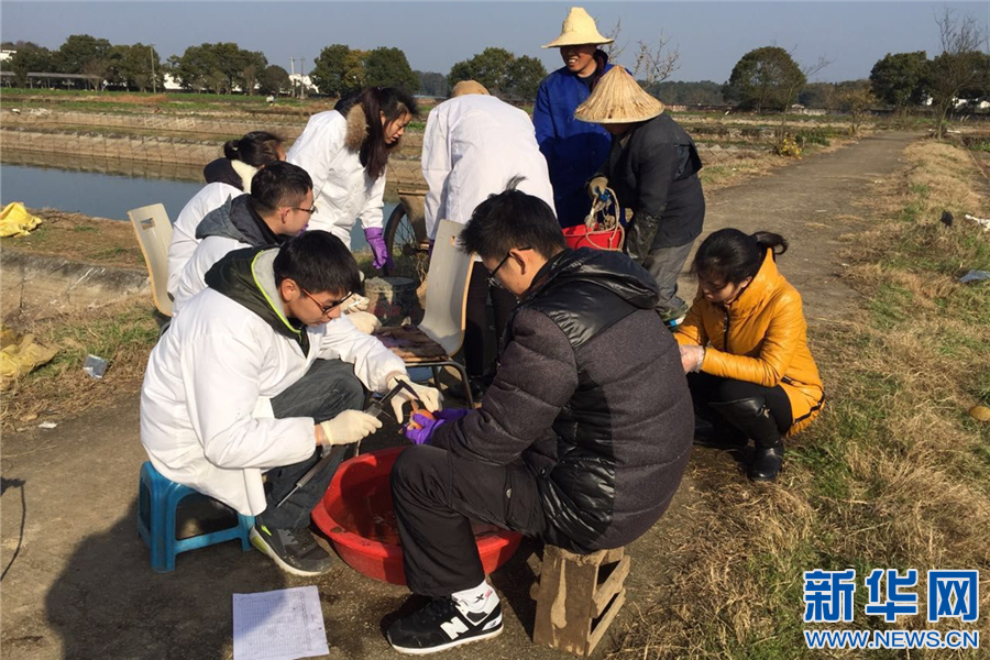 南昌大学师生们在选育婺源荷包红鲤。新华网发 南昌大学供图