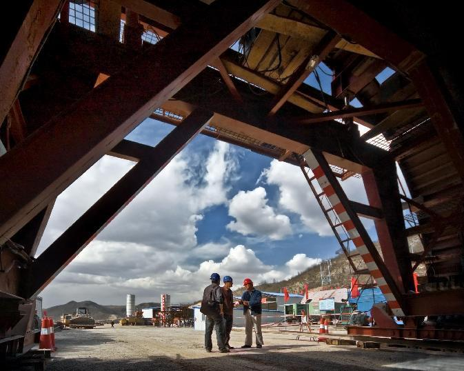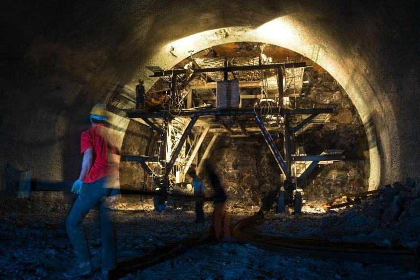 穿梭于太行山脉的高速公路,穿山越岭的隧道数不胜数。图为现场安全员、监理员与施工工段长在隧道洞口的大型作业台车下落实质量安全工作。