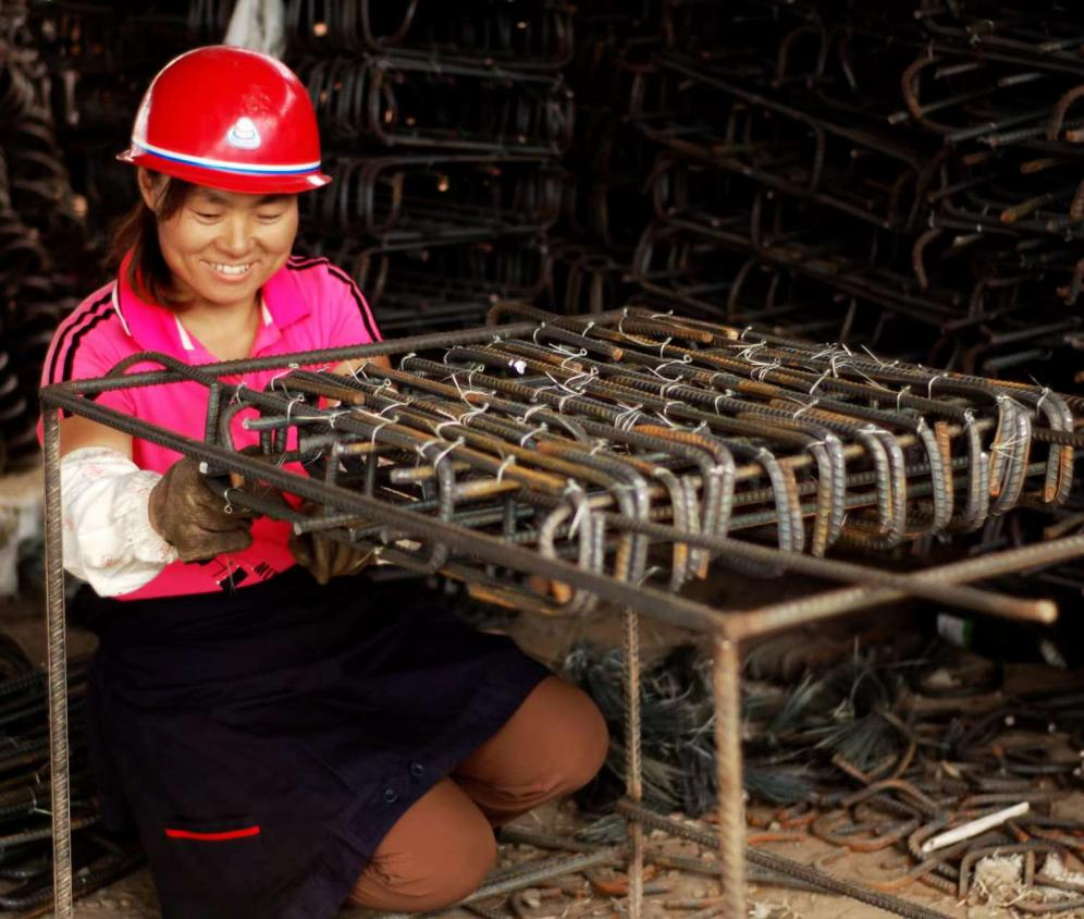 在以男人为主的工地中,女工是一朵朵亮丽的小花。图为混凝土预制构件场绑扎钢筋的女钢筋工。