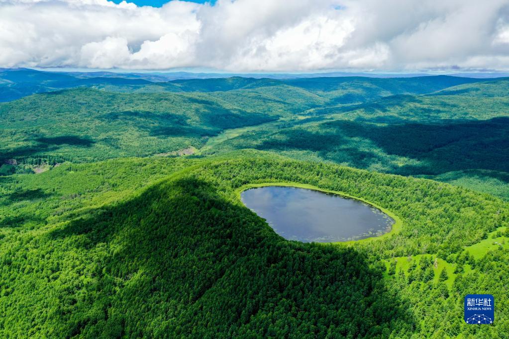 这是内蒙古阿尔山天池风光(2021年7月14日摄,无人机照片)。新华社记者 连振 摄