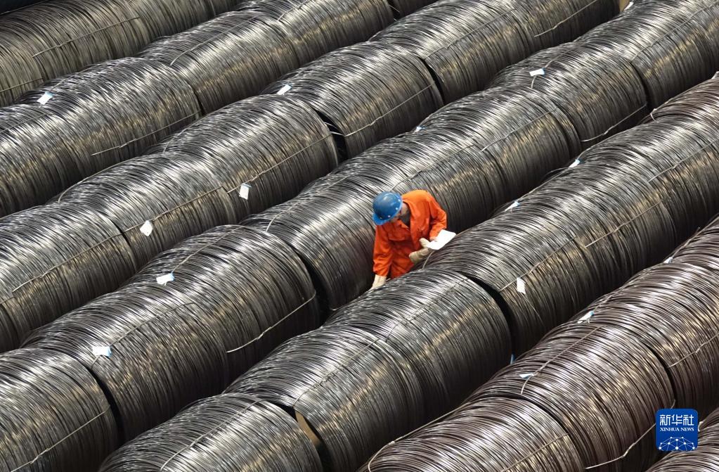 2017年5月15日,东北特钢集团工作人员在核对入库的合金钢大盘重线材产品标识。新华社发(刘德斌 摄)