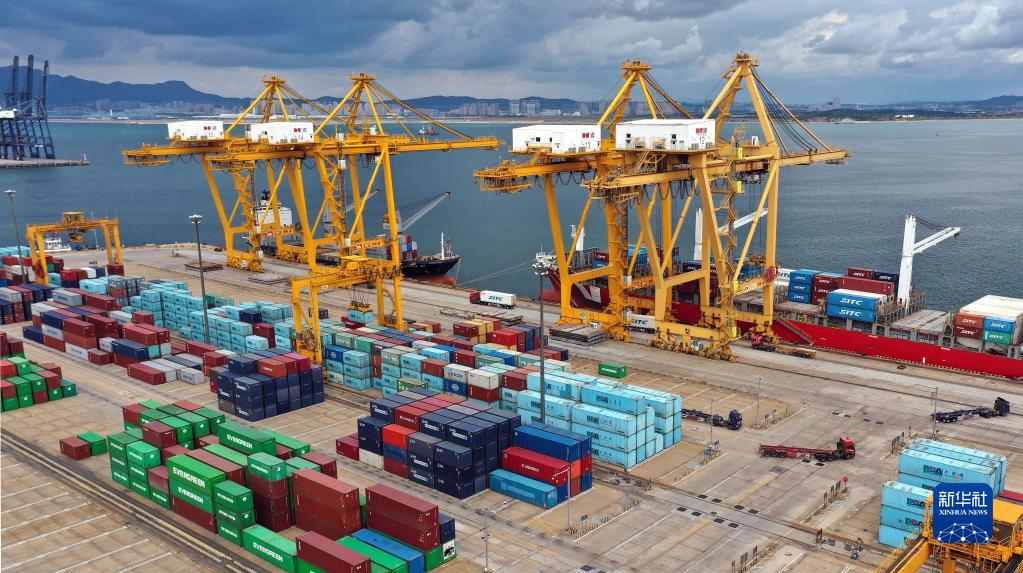 2020年9月24日,货轮在大连港大连集装箱码头有限公司港口装卸集装箱(无人机照片)。新华社记者 姚剑锋 摄