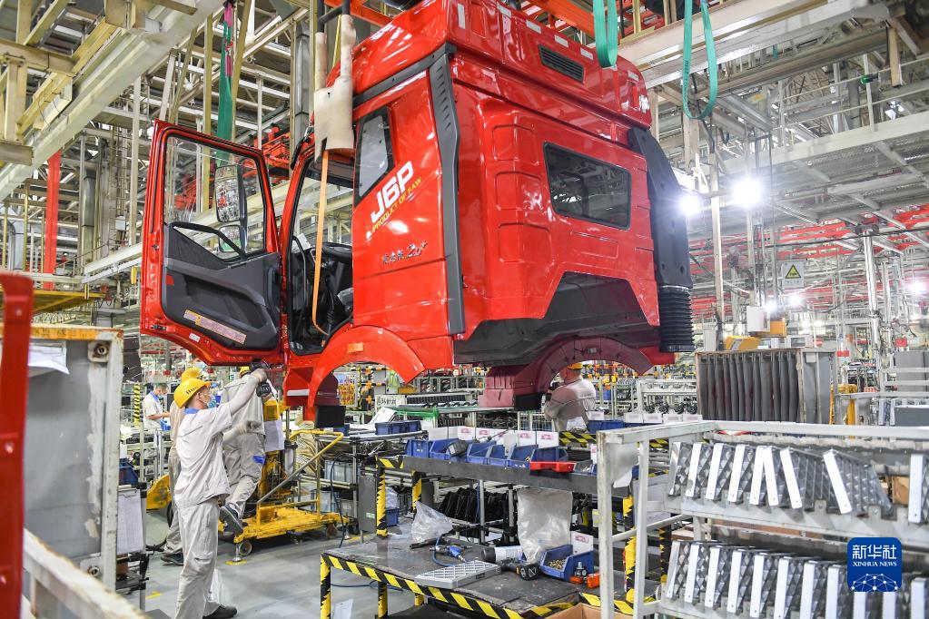 工人在位于吉林省长春市的一汽解放总装车间装配车辆(2021年7月7日摄)。新华社记者 张楠 摄
