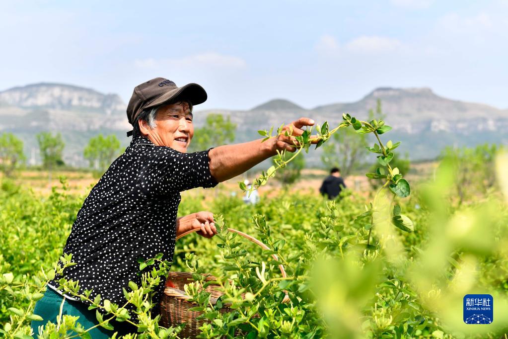 5月22日,在临沂市平邑县郑城镇,村民在采摘金银花。新华社记者郭绪雷摄