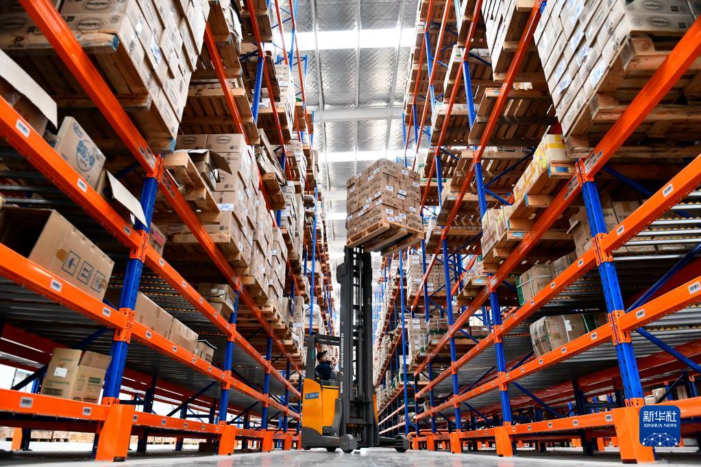 在临沂商谷罗滨逊智慧物流园1号云仓,工作人员在货架上取货物(2020年11月21日摄)。新华社记者 郭绪雷 摄