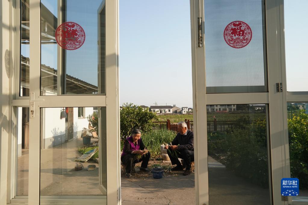 镇江市世业镇永茂圩自然村村民洪家勇(右)和老伴杨松华在家中忙家务(2020年4月13日摄)。新华社记者 季春鹏 摄