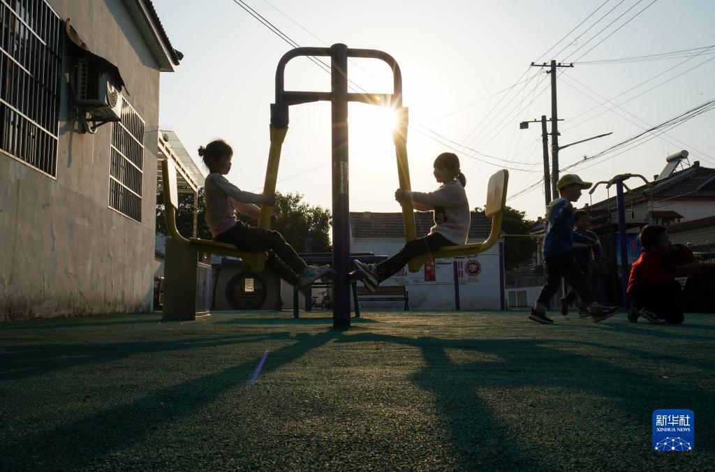 小朋友在镇江市世业镇永茂圩自然村的文化活动广场玩耍(2020年4月13日摄)。新华社记者 季春鹏 摄
